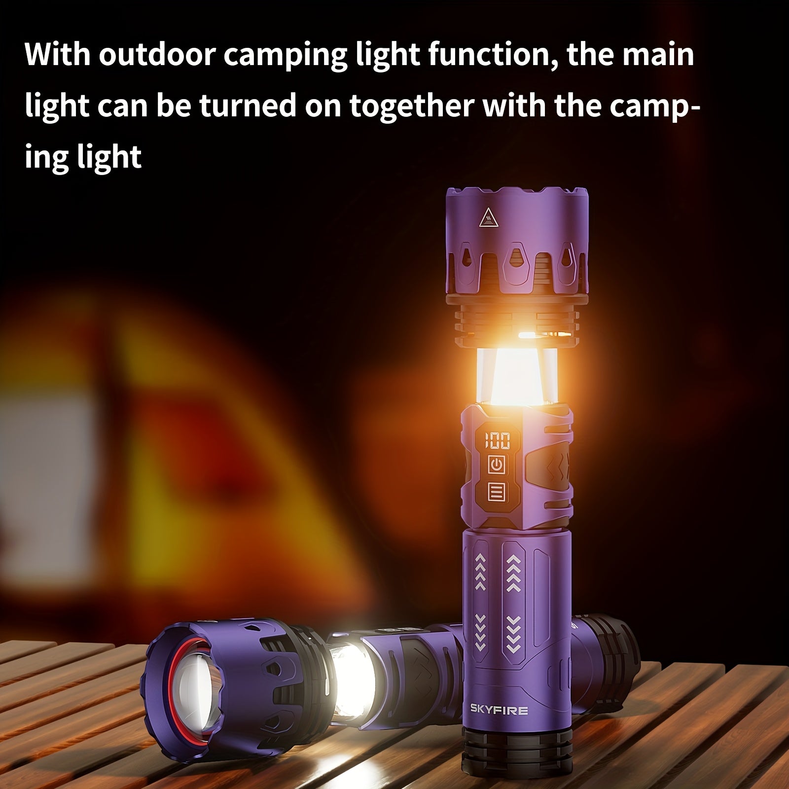 Illuminate your adventures with Skyfire's high-brightness LED flashlight, featuring a zoomable floodlight and a striking purple finish for versatile, reliable lighting.